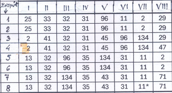 kolumnie - numery zespołów, w górnym wierszu – nr spotkania)