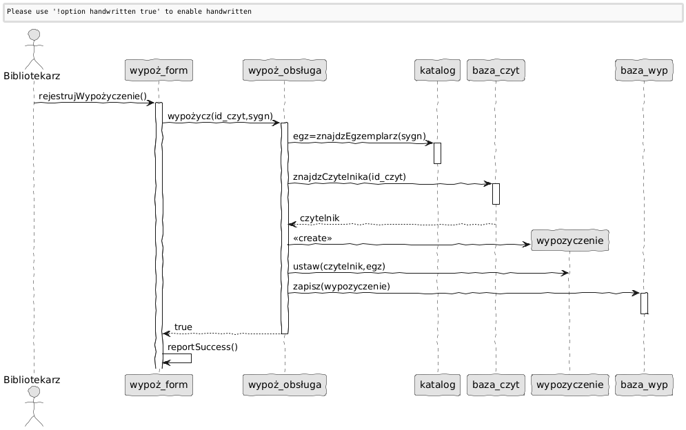 Diagram pokazuje realizację rejestracji wypożyczenia (ale bez przebiegów alternatywnych).
