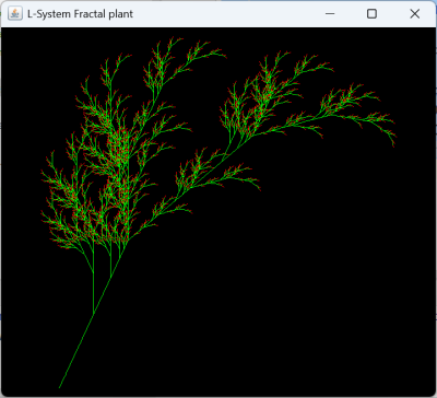public class DrawPanel extends JPanel { Scene scene = new Scene(); LSystem ls; public DrawPanel(LSystem ls) { this.ls=ls; setBackground(Color.BLACK); // możesz też ustawić bitmapę jako tło } @Override protected void paintComponent(Graphics g) { super.paintComponent(g); if (scene.lines.isEmpty()) { String commands = ls.rewrite(); scene.render(commands, ls.getStepLength(), ls.getAngleIncrement(),ls.isAllLetterForward()); System.out.printf("Wygenerowaneo %d linii",scene.lines.size()); } // Wycentruj i wyskaluj obraz // Przenieś układ współrzędnych na środek panelu g2.translate(getWidth() / 2.0, getHeight() / 2.0); // Rotacja - dopasowanie do przykładów g2.rotate(-Math.PI / 2); // Ustal granice sceny Rectangle2D bounds = scene.getBounds(); // Skalowanie – dopasowanie sceny do panelu z marginesem // Zamieniona wysokość i szerokość ze wzgledu na obrót int margin = 20; double scale = Math.min(...); g2.scale(scale, -scale); // Przesunięcie środka sceny do (0, 0) double cx = bounds.getCenterX(); double cy = bounds.getCenterY(); g2.translate(-cx, -cy); // Rysowanie zmieniaj kolory i rysuj linie }