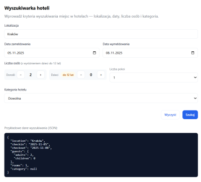 Wygeneruj interfejs w HTML z użyciem JavaScript i CSS z widokiem formularza, w którym wprowadzamy kryteria wyszukiwania miejsc w hotelach. Dodaj elementy umożliwiające wprowadzenie: lokalizacji daty zameldowania i wymeldowania liczby osób (z wyróżnieniem w tym dzieci do lat 12) kategorii hotelu